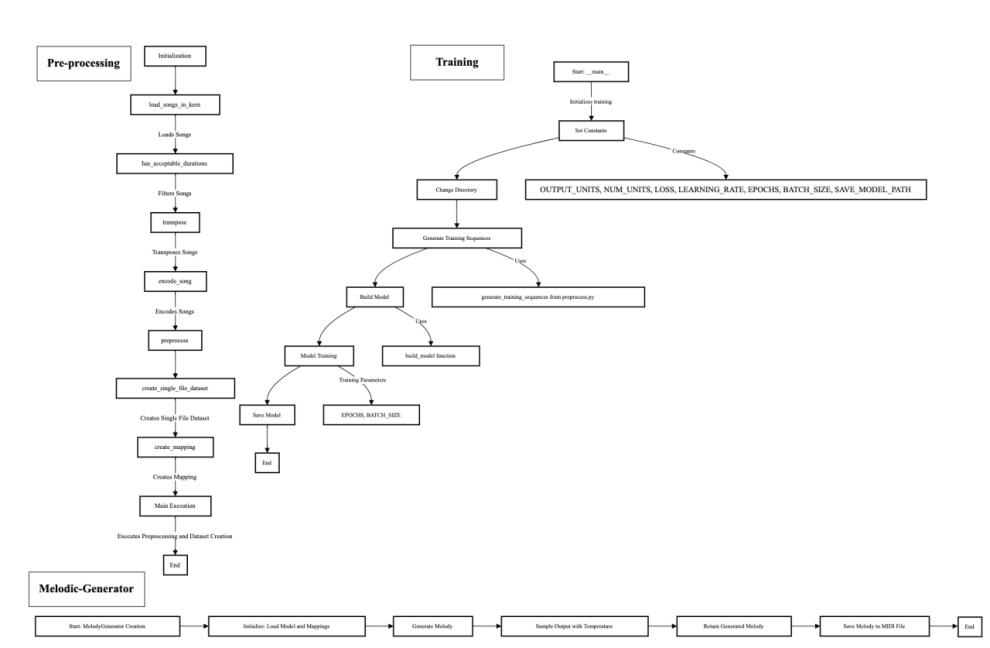 研究首先对现存的八板音乐进行全面的音乐学分析,归纳出其音高行进、节拍落点、句法边界与句末归属等风格要素。这些分析结果既作为训练标签,也作为解码护栏,嵌入到LSTM旋律生成模型中。在模型训练阶段,采用RNN/LSTM对音高-时值序列进行建模(教师强制训练),并在解码阶段引入板腔与句末归属约束,抑制“越界”与“违式”片段;同时以滑窗在“气口—身法节拍—落点”之间二次筛选,保障乐句的呼吸与张力。